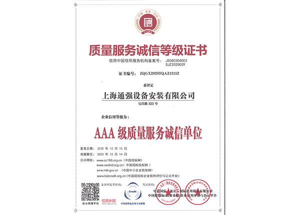 上海通強設備安裝有限公司注冊資金2000萬元,資產總量為100000萬元的專業設備安裝公司,公司專業從事工業與民用建筑的設備安裝、非標設備的制作、鋼結構制作安裝、中央空調系統的安裝,水電及管道的安裝。經過20多年艱苦創業現已成為一個具有國家二級安裝資質,獲得上海市“重合同,守信用”的施工單位。